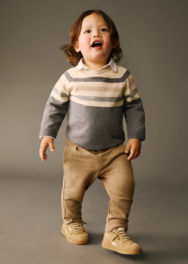 Długie spodnie dla niemowlęcia typu chino z miękkiej i lekko rozciągliwej tkaniny. Zapięcie na jeden guzik. Regulowana gumka w pasie dla lepszego dopasowania. Z przodu praktyczne kieszenie. Ze względu na wymogi bezpieczeństwa, mniejsze rozmiary (2-5 lat) posiadają imitację rozporka, bez zamka.